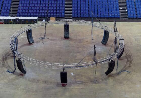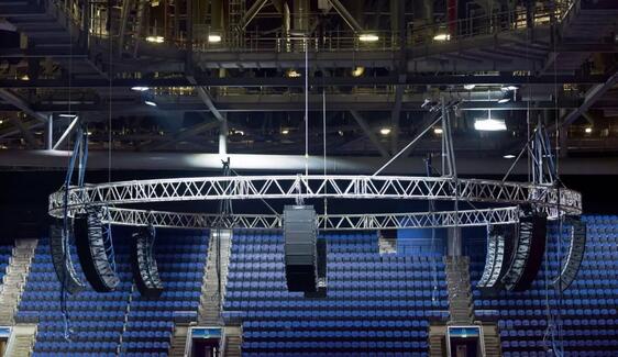 音響裝置必須能夠滿足體育館多種用途的要求,在舞臺(tái)位于一側(cè)和位于中央時(shí)均可使用。從中央環(huán)形桁架開(kāi)始,8個(gè)Bose揚(yáng)聲器組中的每個(gè)揚(yáng)聲器組都包含8個(gè)已經(jīng)安裝就位的ShowMatch音箱,確保聲音能夠覆蓋主要觀眾區(qū)。